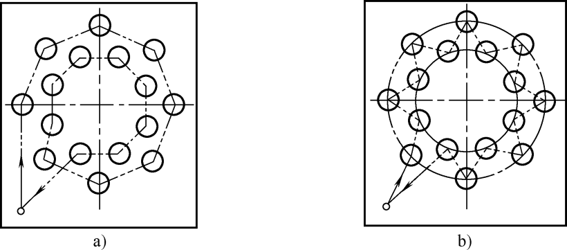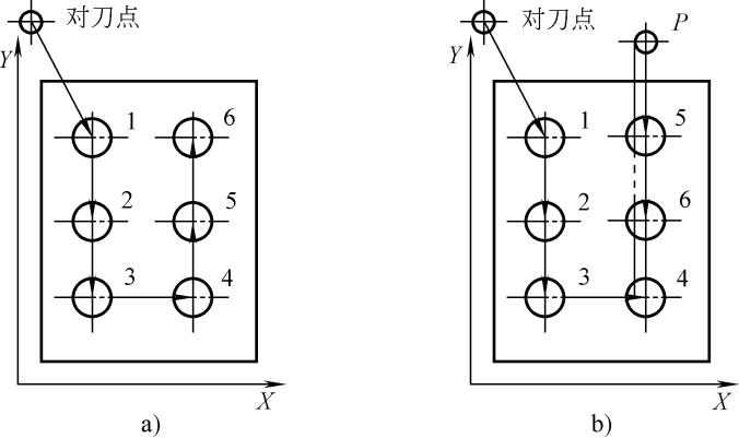 对点位控制机床,只要求定位精度高,定位过程尽可能快,而刀具相对于工件的运动路线无关紧要。因此,这类机床应按空行程最短来安排加工路线,如图14a所示。但对位置精度要求较高的孔系加工,在安排孔加工顺序时,还应注意各孔定位方向的一致,即采用单向趋近定位的方法,以避免将机床进给机构的反向间隙带入而影响孔的位置精度,如图14b所示。