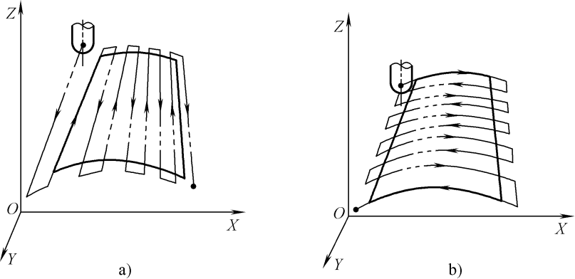 2)对曲率变化较大和精度要求较高的曲面的精加工,常用三坐标联动插补的行切法加工,如图7所示。
