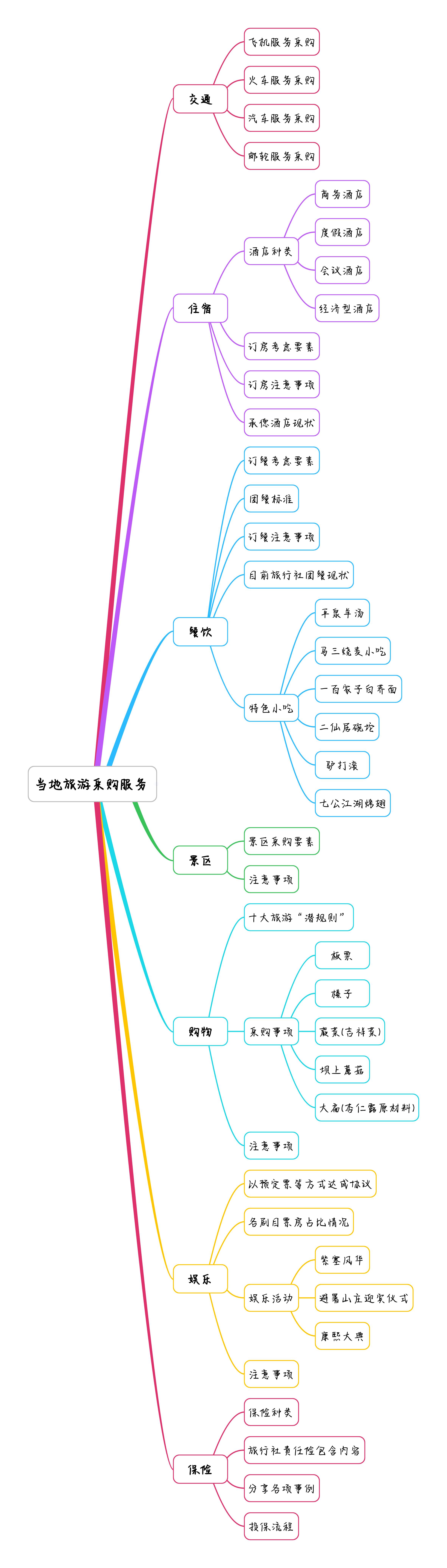 同学们,在开始本阶段内容学习之前,大家一定仔细阅读下面的思维导图,根据思维导图提示,可以清晰的了解到接下来我们要完成的当地旅游服务采购工作任务中的具体工作内容,好好观看哦!