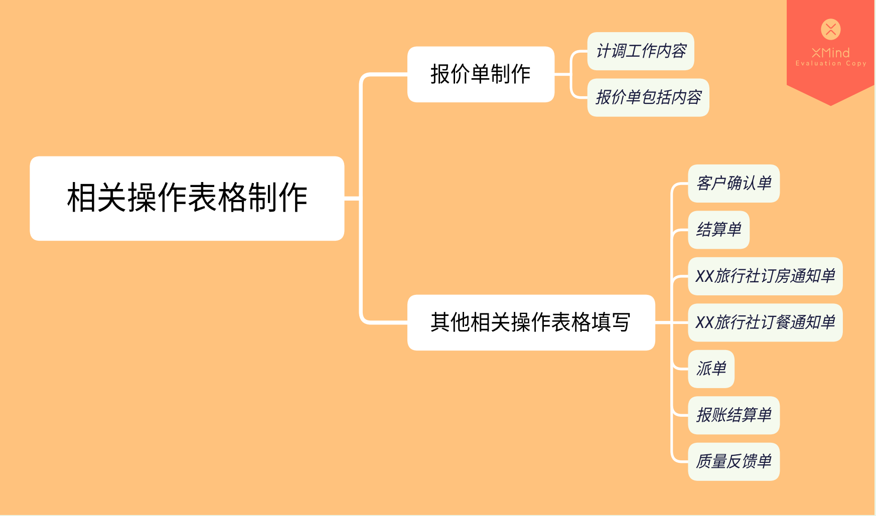 同学们,在完成当地旅游服务采购后,即将进入到相关操作表格制作的工作任务中,,根据思维导图的提示,看看有哪些表格需要我们掌握。