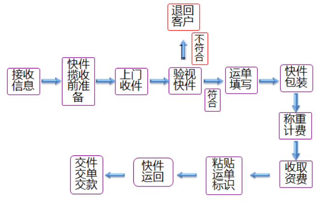 上门收寄是指快递业务员到客户家里或办公地点收取快件,并询问、验视、封装、填写单据和收取费用的过程。具体流程如下