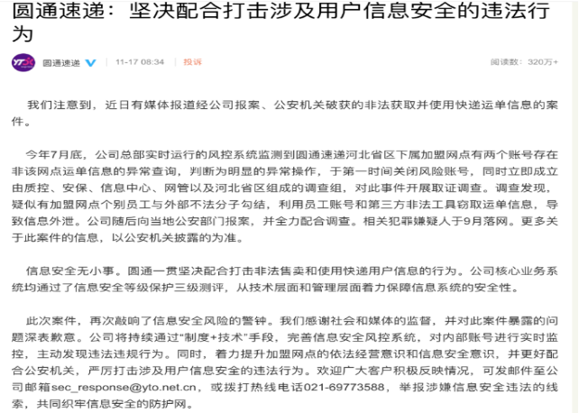 (来源:圆通快递40万条个人信息泄露!一张快递单竟能知道这么多..._员工 )