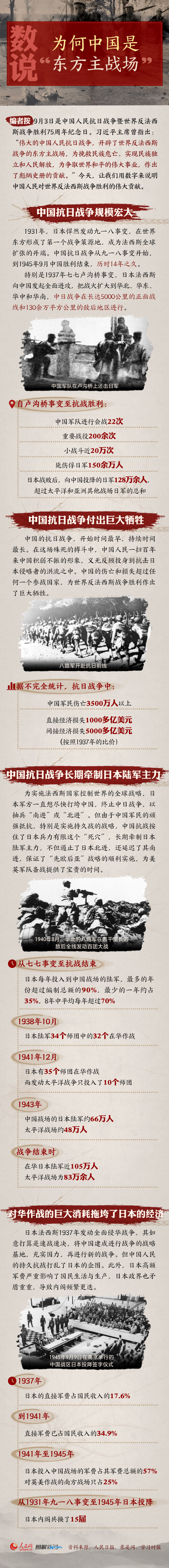 中国人民的抗日战争是世界反法西斯战争的重要组成部分,是世界反法西斯战争的东方主战场。在抗日战争时期,中国战场年平均牵制日本陆军74%以上,最高年份达90%。日军在海外作战中损失的287万人中,有150万人伤亡在中国战场。中国坚持持久抗战,不仅遏制了日本的“北进”计划,迟滞了日本的“南进”步伐,而且大大减轻了其他战场的压力,为同盟国军队完成太平洋战场的战略转折和实施战略反攻创造了有利条件。美国总统罗斯福曾说:“假如没有中国,假如中国被打坍了,你想一想有多少师的日本兵可以因此调到其他方面来作战?他们可以马上打到澳洲,打下印度——他们可以毫不费力地把这些地方打下来。他们可以一直冲向中东——和德国配合起来,举行一个大规模的夹击,在近东会师,把俄国完全隔离起来,吞并埃及,切断通过地中海的一切交通线”。抗日战争牵制了日军主力,粉碎了法西斯轴心国东西配合、称霸世界的图谋,为英、苏、美等反法西斯力量赢得了宝贵的应战时间。中国作为亚洲太平洋地区盟军对日作战的重要后方基地,为盟国提供了大量战略物资和军事情报。从1942年4月起,中国先后为盟国提供了昆明、成都、桂林、柳州、衡阳等10多个机场。盟国的飞机利用这些机场来轰炸沿海日军船只、东京及其附近战略目标,从而使日本通往南太平洋的海上运输线和本土均受到重型轰炸机的空袭,直接支援了美军在太平洋战场上的对日战争。东方主战场,这是彰显中国在世界反法西斯战争中地位的形象表达。