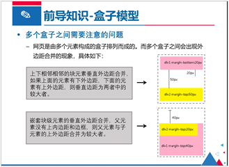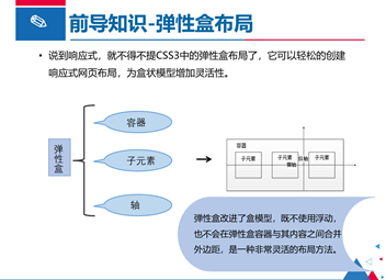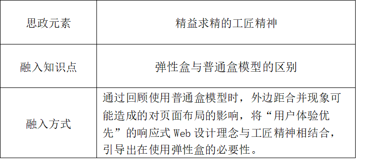 案例思路:先引导学生回顾先修课中学过的普通盒模型的外边距合并现象,说明该现象在响应式Web设计中可能会对页面布局造成干扰;鼓励学生发扬工匠精神,精益求精,这一点与响应式Web设计中“用户体验优先”的指导思想完全契合;就此引出弹性盒的概念,阐明弹性盒可以很好地避免这一问题,使得页面布局细节可控,进而顺利开展关于弹性盒布局的学习。