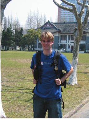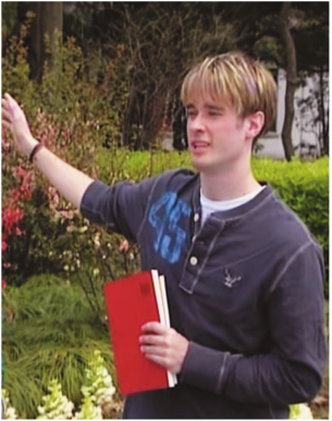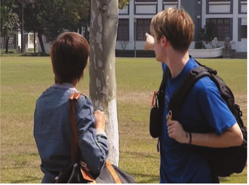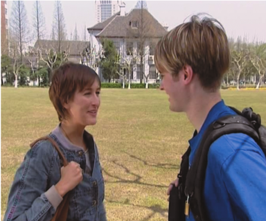 7) Adam looks grateful when he is told how to get to the International Students Center.
