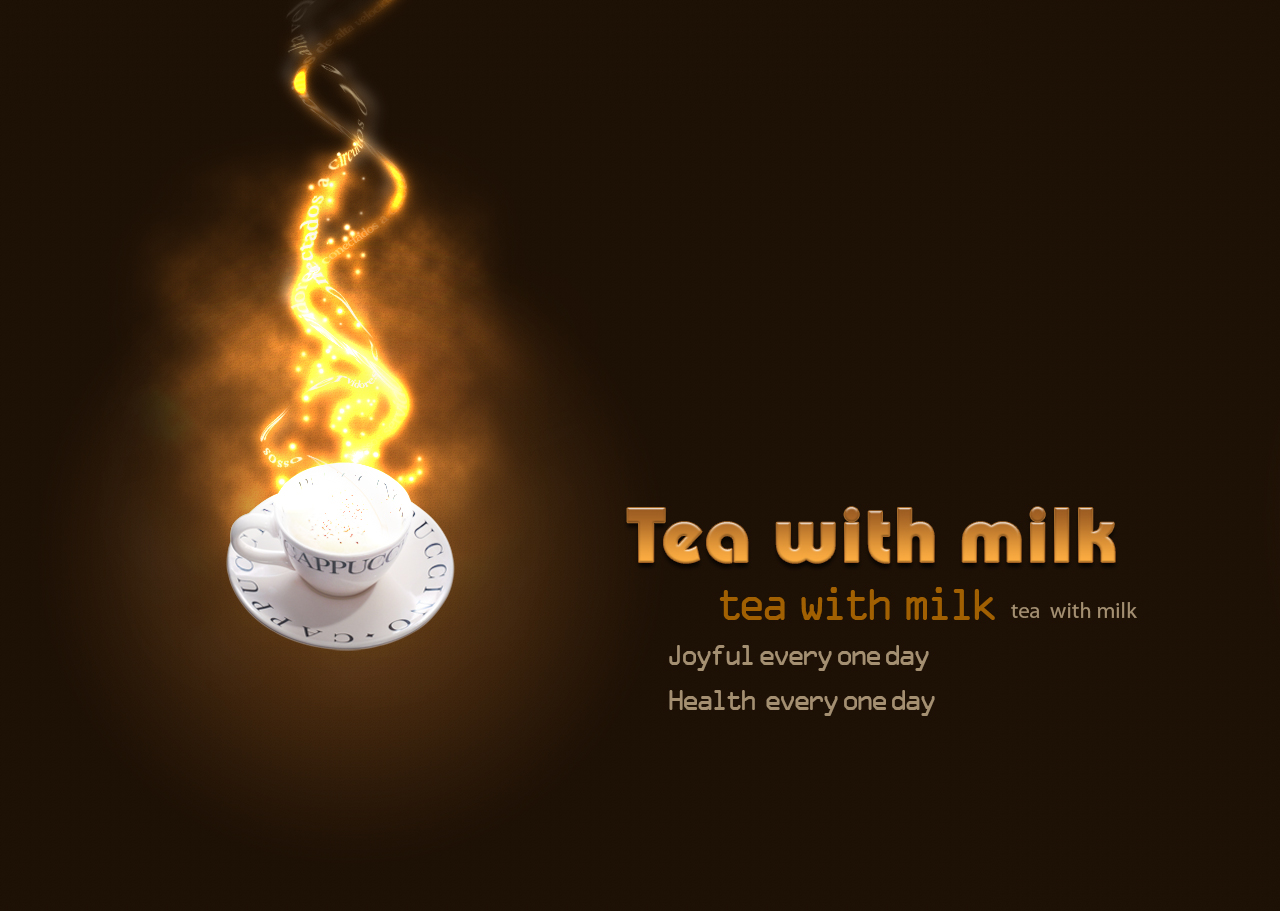 17. 输入“Tea with milk”,设置渐变叠加(#ffaf42—#9a5a21),确定,CTRL+T,改变其大小,再设置斜面浮雕效果(深度为61,大小为0,软化为2,描边大小为1);