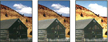 原图(左图);仅应用于谷仓的调整图层(中图),该图层显示了谷仓中的细节;以及应用于整个图像的调整图层(右图),该图层加亮了整个图像并将云彩像素化