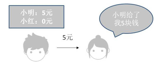 第一种方式是,小明可以把现金纸币5元钱给小红,不需要经过诸如银行、支付机构、见证人等中介机构。但是,随着互联网的普及,电子支付越来越流行,人们越来越少使用纸币。在电子支付中,就会有一个权威中介机构(比如银行)负责记录这笔转账交易。
