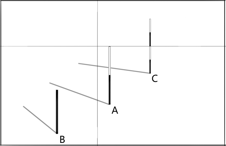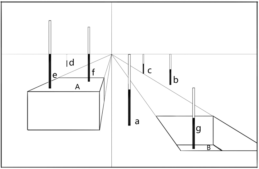 透视视高法,顾明思议是通过透视视高来确定透视画面中不同位置物体的高度的方法。我们在前面的透视系统中认识了视高,它是指在透视画面中,被画物体所在的基面(地面,台面或桌面等放置物体的平面)与基面的灭线之间的竖直高度,如果是平视地面上的物体,视高就是地面到达地平线的竖直距离。如图Z110所示的透视场景中,几根尺寸相同位置不同的直立黑白杆分别置于地面,台面以及坑底,画者平视。那么地面,平台和坑底就是不同的基面,每个基面对应不同的视高。其中平台顶面A到视平线的竖直距离是1/2黑白杆高度,即基面A的视高是1/2杆高。所以,放置在平台A面上的竖直棍杆的1/2处位于视平线上。