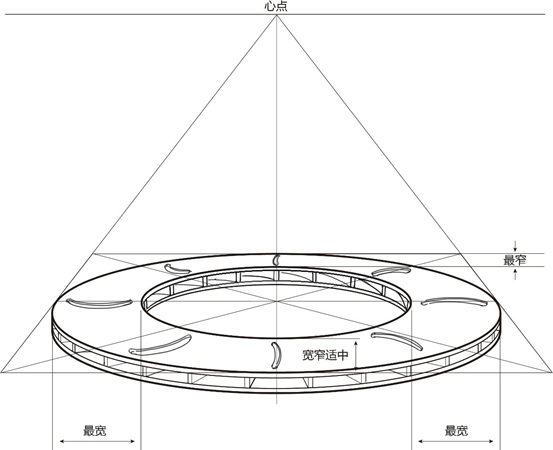 2.同心圆曲线:将半个半个的同心圆错位相连,就形成了类似S形的连续曲线,这种S形鼓起部分的两侧变现我们就呈之为同心圆曲线。这种图形的结构如同汉字的“回”字,平行于画面的两曲线之间的距离窄,垂直于画面的两曲线之间的距离宽,如下图所示。