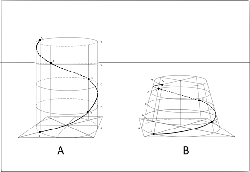 3.螺旋曲线:沿着圆柱的侧面均匀旋转上升的曲面叫做螺旋曲线,最直观的例子就是弹簧。画螺旋曲线时,我们先用透视画法画好圆柱,在圆柱上按比例要求做正方形投影透视网格,然后将网格的对角线连接就可以了,以圆柱为平台所得的螺旋线半径不变,以圆台为平台所得的螺旋线半径渐渐改变,如下图所示。