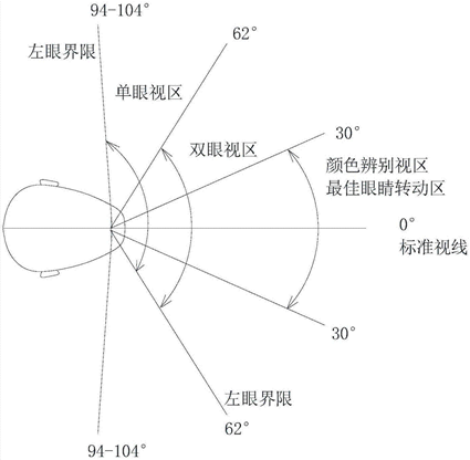 什么是视域,顾名思义就是视力所及的区域,我们人类的眼睛虽然长在头的正前方,却可以看到头前方水平方向188度左右扇形面积内的物体,竖直方向140度左右扇形区域内的物体,这个区域几乎囊括了人正面的所有空间。这种有趣的生理结构可能是来自于祖先的进化,毕竟看的范围大一些能够更早地发现猎物或者危险。很多动物的视域甚至更夸张,比如马,它的眼睛长在头的两侧,视域几乎涵盖360度,真正做到全方位观察敌情。所以不要以为站在马后它就发现不了你,很危险的哦。人的视域分布图如图11所示。