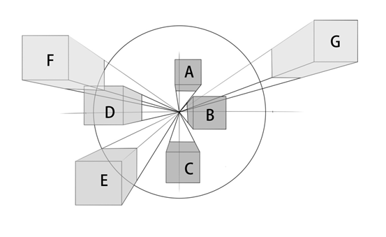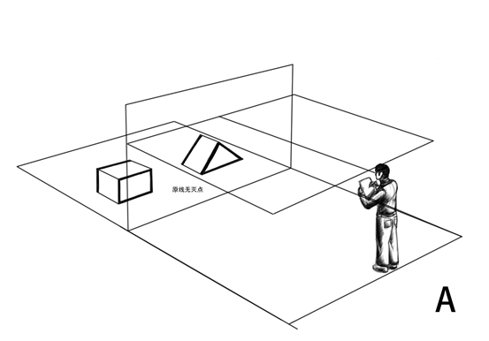 视距是视点到画面的距离,每一张图画都有自己固定的视距,在画同一张图的过程中,视距始终保持固定不变,只有这样才能顺利运用所有透视原理进行绘图。视距的大小直接决定了透视图的画面内容和透视剧烈程度。通常我们可以通过固定画者和被画物体,改变画面的位置来改变视距。也可以通过固定被画物体与画面,改变画者位置来改变视距。这两种视距变化的情况会产生不同的画面透视效果,我们来通过具体图例进行分析。