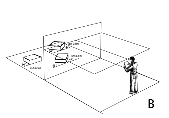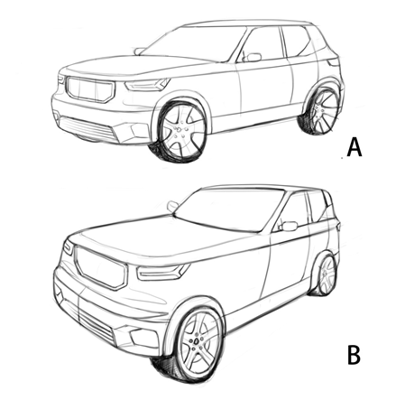 第二种情况是画面和物体保持位置不变,改变画者的前后位置,从而改变视距。这种情况相当于改变了画者和被画物体的距离,大家记住,这个距离的改变在人眼凸透镜成像原理的基础上,一定会改变物体在人眼中的成像形式,因为凸透镜的物距改变了,于是形成透视的变化。由于画面和被画物体之间固定不变,因此,画面内的内容不变,但随着画者离开画面的距离增大,画面会呈现长焦镜头的效果,画面的纵深感变短,画面的透视程度变得缓和。相反,当画者向画面靠近时,画面呈现广角镜头的特性,即纵深感变强,画面的透视程度变的剧烈。视距越远,画面的透视状态越接近平面化。如图9所示,A图为远视距下的产品透视图,视觉感受平稳舒适。B图为缩小视距后的透视效果,此时,画者的离汽车非常近,大概在1米的范围左右。此时的近视距造成物体发生剧烈的透视,车身的部分边线开始发生倾斜。