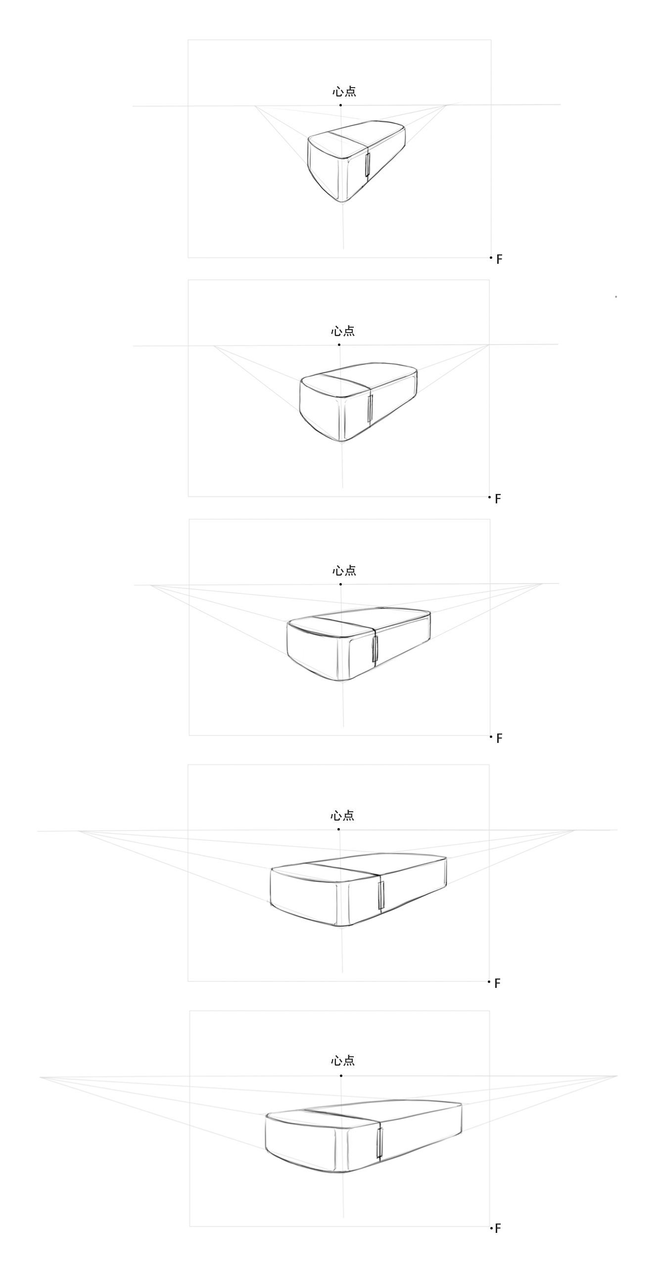 地平线在画面中起到了参考线和标尺的作用,在透视的画面表现中,地平线控制着物体水平面和水平线段的透视状态。地平线是所有水平面的灭线,所有与水平面平行线的灭点都在地平线上。画面中地平线以下的水平面我们可以看到它的顶面,地平线以上的水平面我们可以看到它的底面,刚好处在地平线位置的平面既看不到顶面也看不到底面,程一条水平线。等大的水平面,在画面的垂直方向上越接近地平线,所展现的面积越小,越远离地平线,所展现的面积越大。这一规律在我们进行产品草图表现的时候非常有用,地平线的位置可以很好地为我们划分水平物体的位置,地平线分割水平面位置的原理其实和其他灭线与相应平面的原理相一致,这点我们在后面论述灭线的时候会着重介绍。