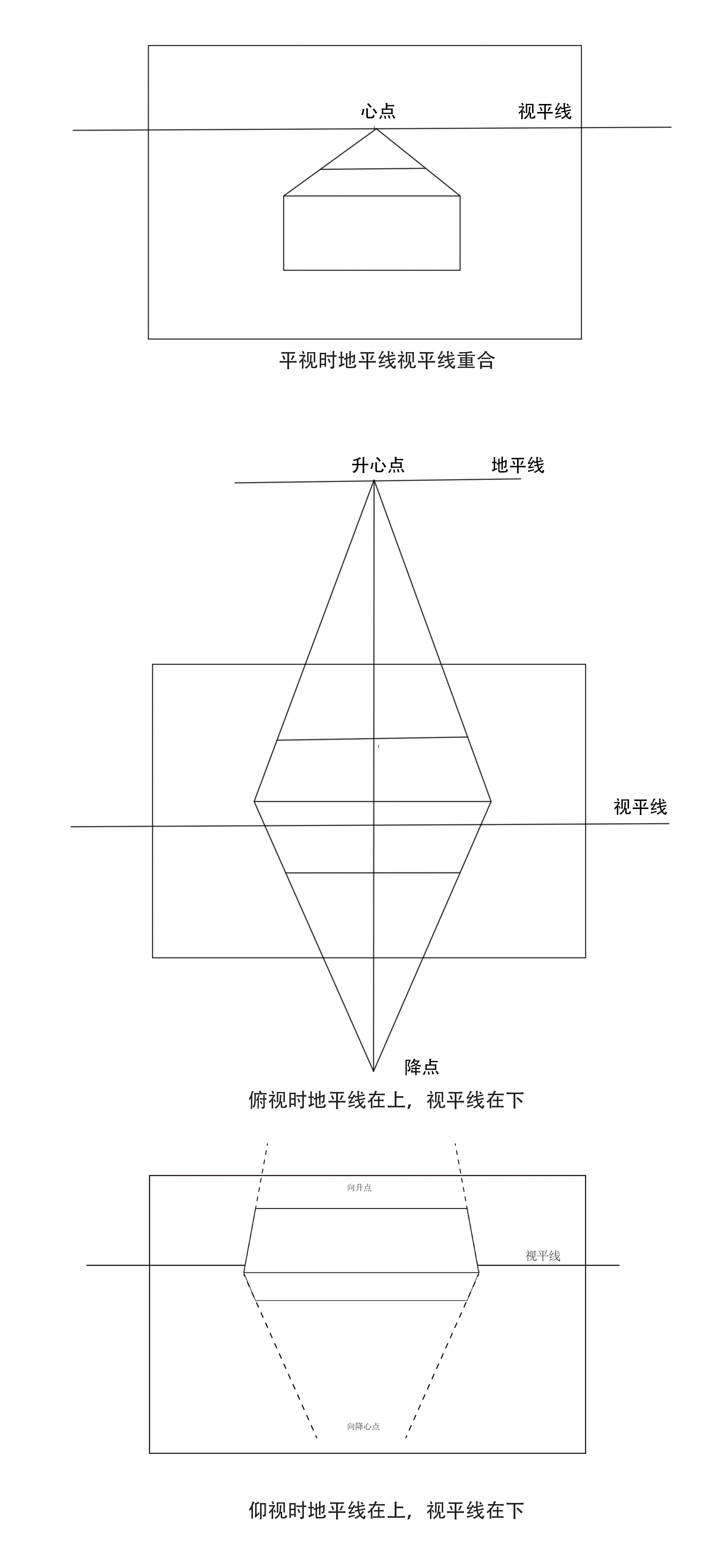 视平线是所有与视平面平行的平面的灭线,这些线我们叫做平线,即与视平面平行的线。除此之外所有与视平面不平行的线我们叫做斜线,他们的灭点在视平线上或者下,分别叫做升点和降点,其中与视平面垂直的线我们叫做竖线,因为垂直于视平面所以必然平行于画面,所以属于原线,没有灭点。视平线也是所有平行于视平面的平面的灭线,作为灭线,视平线同样担当着分割平面位置的作用,所有平行于视平面的平面中,在视平线以下的我们都能看到顶面,在视平面以上的我们都能看到底面,刚好处在视平线位置的平面我们只能看到一条线。多数情况下我们画图的视向是水平的,造成视平面是水平面,地平线与视平线重合。当视向发生改变,画者改为仰视或俯视时,地平线与视平线分离,此时视平线与地平线仍然各自担当着灭线的职责,图面中的平面即线段也都各自遵守着与它们的位置关系。