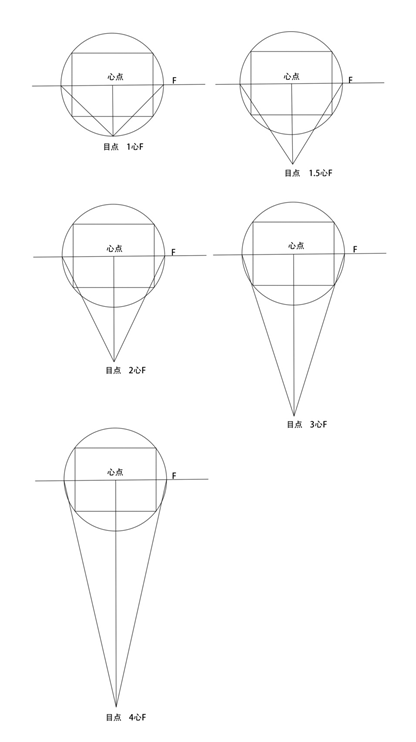 在取景框位置和大小不变的前提下,视锥顶角的大小实际上就是视距变化的结果,从下图我们可以了解到,随着视距的增大,视锥顶角逐渐变小,我们以心点至取景框最远一角的距离为半径画圆,我们可以认为此圆就是对应此取景框的视锥与画面的交线。我们假定这个圆的半径为R,那么视锥的高就是视距。根据几何作图法我们知道,当视距为R时,视锥顶角为90度,显然已经超出正常视域的范围,说明我们此时看到的取景框里的图像会产生很大的变形。画者远离画面,继续增大视距,当视距分别是2R,3R,4R时,对应的视锥的顶角分别为53度,37度和28度。我们发现随着视距的增大,取景框开始进入正常视域内。随着视距的增大,取景框中物体的透视会变得越来越平缓,物体被拉伸和变形的情况会越来越小。