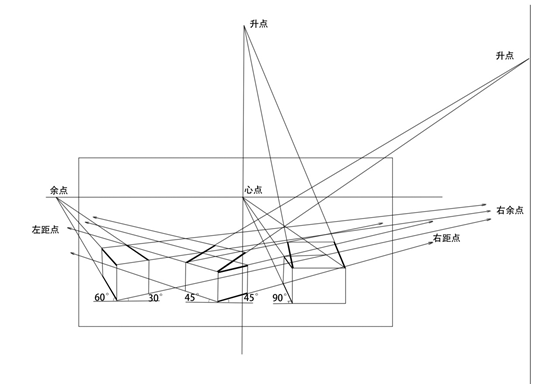 透视学的研究重点之一是平行线发生汇聚的规律,我们首先将画面中的线进行划分,哪些平行线会发生汇聚,哪些不发生汇聚。通过几何原理,我们发现,所有与画面平行的线,在画面中任然保持自己的方向并且一组平行线同样保持平行,不发生汇聚。所有与画面不平行的线我们称之为变线,变现在画面中的透视方向与空间中的原方向不同,相互平行的变线在画面中汇聚向同一个灭点,其中垂直于画面的变线的灭点是心点。与画面不垂直但与视平面平行的变线的灭点在视平线上,我们称之为余点。其余的既不与视平面平行,也不与画面垂直的变现的灭点分别是升点和降点,其中向视平线上方倾斜的成组平行变线汇聚向升点,向视平线下方倾斜的成组平行变线汇聚向降点。我们通过下图来系统了解原线和变线。