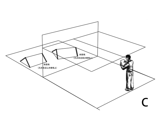 灭线位置的寻求:要寻找一个物面的灭线,理论上可以过画者眼睛做一个平行于该物面的平面,这个平面与画面的交线就是该物面的灭线。以下是几种寻求灭线的图例。