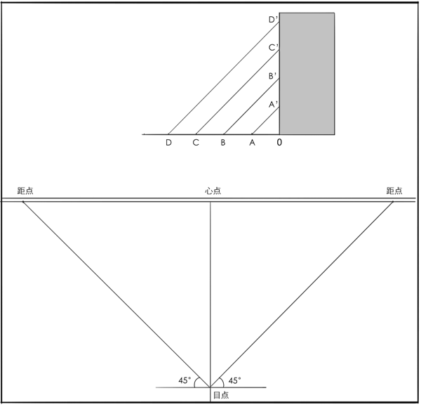以水平线段为标尺,以水平线段和垂直画面线段的端点为坐标原点,那么在水平线上任一点连接距点都会与垂直于画面的直线相交,这条连接距点的线与水平线段呈45度角,那么截得的水平线段和垂直画面的线段就分别是等腰直角三角形的两条直角边,它们是相等的关系,于是用此方法就可以确定平行透视方体的纵深方向透视长度了。