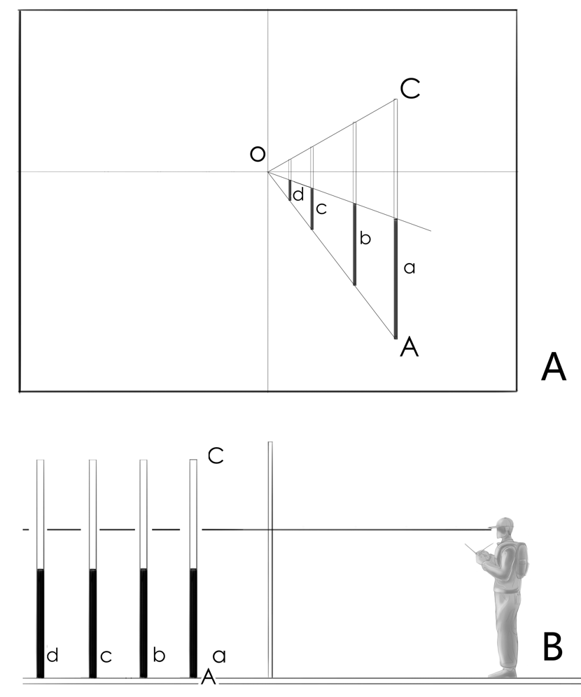 透视缩尺法是另一种寻求透视空间物体远近大小的方法,同视高法在本质上具有类似的理论基础。视高法是利用相互平行的平面间截得的平行线段等长的原理,而透视缩尺法则利用平行线间截得的平行线段等长的原理,可见“平行等分”是它们共同的理论基础,不同的是:一个是从平行面的角度思考,一个是从平行线的角度思考而已。如图所示,标杆a竖直立于画面中,自标杆的杆顶C和杆足A分别引 直线到心点o,则oA与oC为相互平行的一组直线。那么在直线oA上竖直放置等长的标杆b,c,d这些标杆的顶端都会卡在直线oC上,图Z114B是图A的侧视图,我们可以看到oA与oC是平行关系,因此它们之间截得的竖直线段是相等的。在画成排的路灯的时候,透视缩尺法是很好的方法。