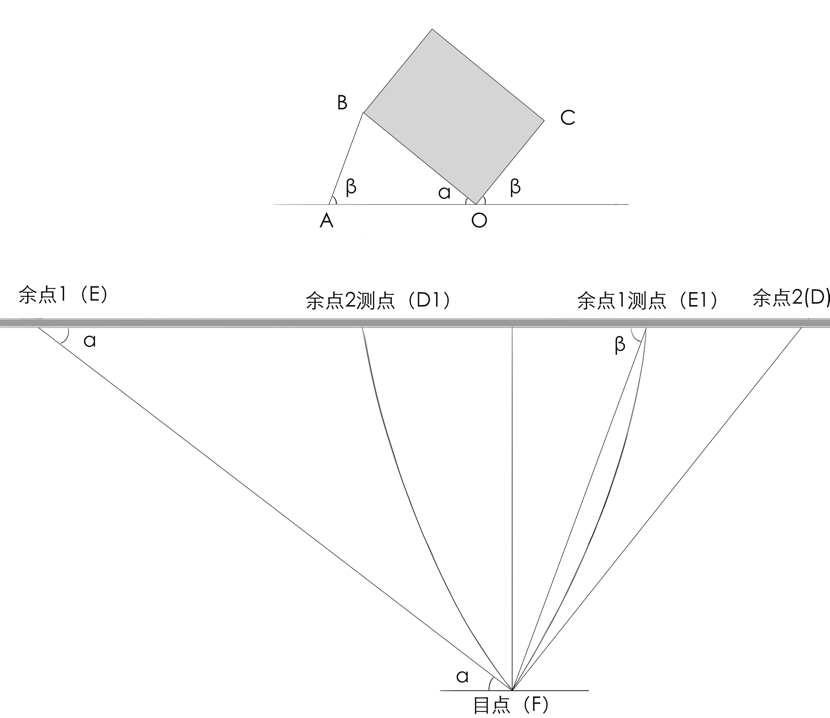 测点位置的确定是通过几何关系得出的。通过图Z48-2我们来分析一下测点法求余角透视长度的几何原理。图Z48-2是典型的方体余角透视状态下场景的顶视图,属于一般余角状态,方体两个竖立面与画面成角分别为α与β。自目点做两条射线分别与目线成角α和β,则两射线与视平线的交点E和D分别是方体两条余角边OB和OC的灭点。以OB边为例,过方体顶点O做水平标尺,此标尺与视平线及目线平行,作为测量工具。EF与EE1等长,连接FE1得到一个等腰三角形,顶角∠FEE1角度为α。射线FE1为自目点发出的射线,与视平线的交点是E1,可以看作是灭点寻求线,透视图中所有与FE1平行的直线的灭点都是E1,因此过B做FE1的平行线BA与水平标尺交于A,则BA就是透视图中自水平标尺向测点(E1)的引线,如果能证明OA与OB相等,就能说明测点法是合理的。由于AB与FE1平行,∠OAB与∠EE1F相等,∠AOB与∠FEE1相等都是α,因此,△OAB与△FEE1是相似三角形,那么△OAB也是等腰三角形,则OA与OB等长,由此可见,测点法在几何意义上是可以被证明的。
