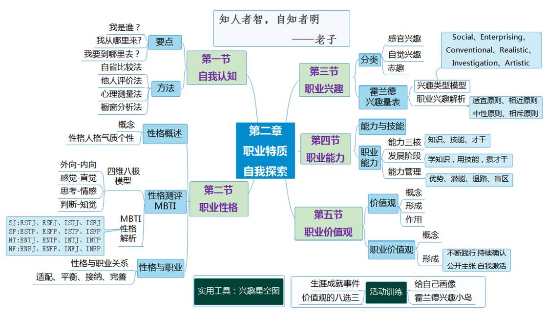 1.知识目标:了解自我认知的维度、途径和方法,掌握职业性格、职业兴趣、职业能力、职业价值观的相关知识。