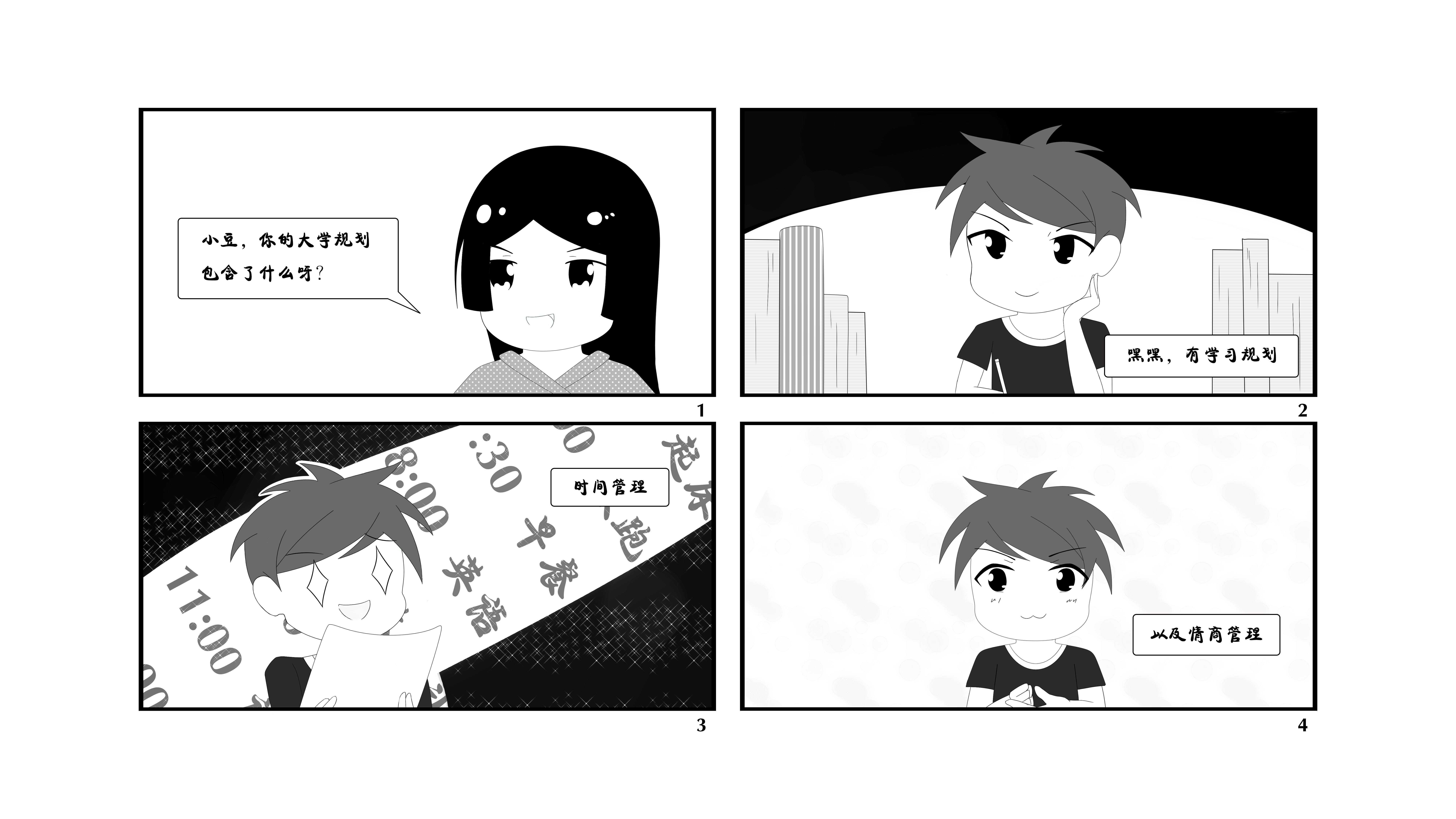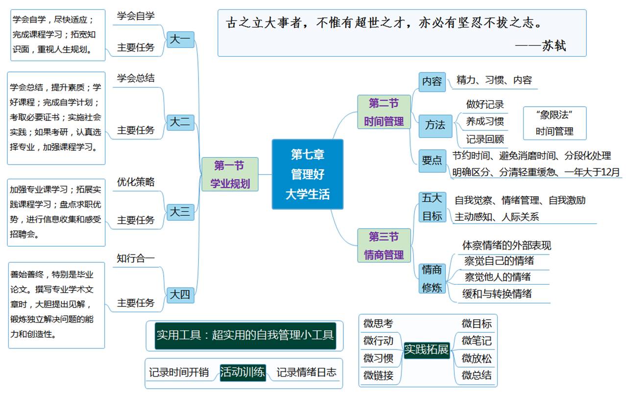 1.知识目标:掌握大学四年的学业规划重点,提高对情商和时间管理方法的了解。