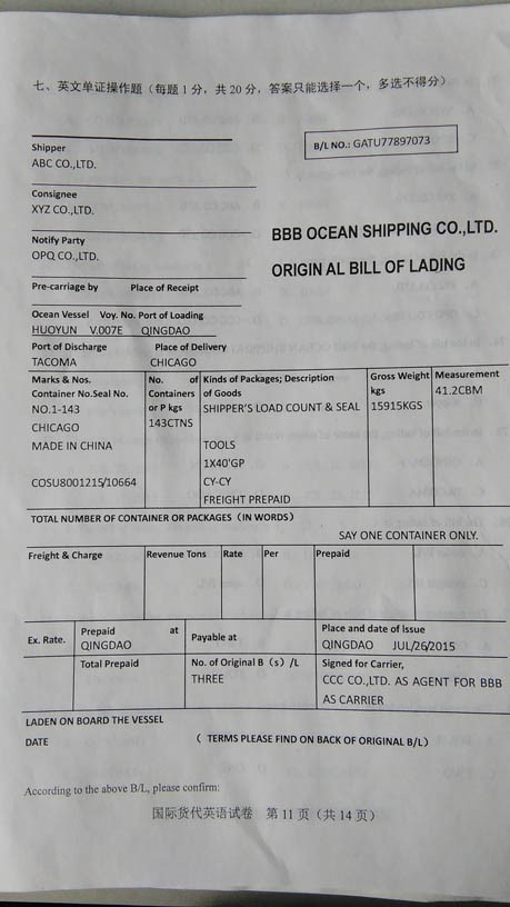 Situation:The shipper(the exporter) has oneconsignment of cargo (1×40’GP, one box/unit of 40’GP)to be transported from Qingdao to Rotterdam.He is consulting with the freight forwarder about marine cargo transportation.