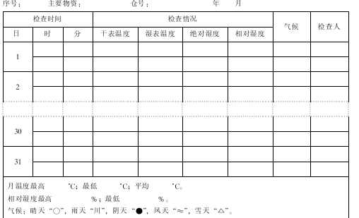 1)湿度监测。仓库应经常进行湿度监测,包括空气湿度和仓内湿度监测。一般每天早、晚各监测一次,并做好记录,如表3-6的“温湿度记录表”。