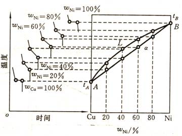这里简单介绍采用热分析实验法建立相图:首先配制若干组不同成分的合金,然后将不同成分的熔融态合金,以极缓慢的冷却速度冷却,用热分析法测定它们的冷却曲线(温度―时间曲线);其次找出各冷却曲线上的临界点(即转折点和平台)的温度值。在温度―成分坐标系中标注各临界点,用平滑曲线连接相同意义的临界点,即得出该合金的相图,如图3-1所示。