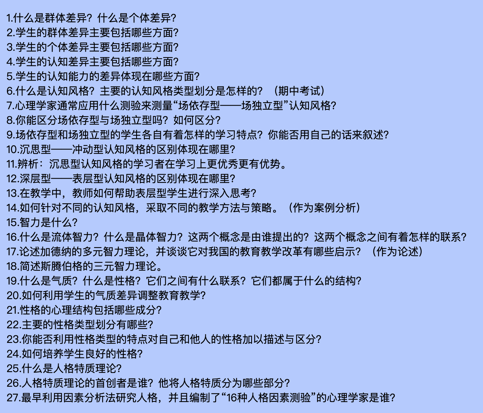 以上27个问题来自“第三讲 学生的群体与个体差异”部分。这一部分通常会以案例的形式,来考察学生对于认知风格的差异、气质的差异与性格的差异的判断和理解。因此结合案例来进行分析很重要哦~