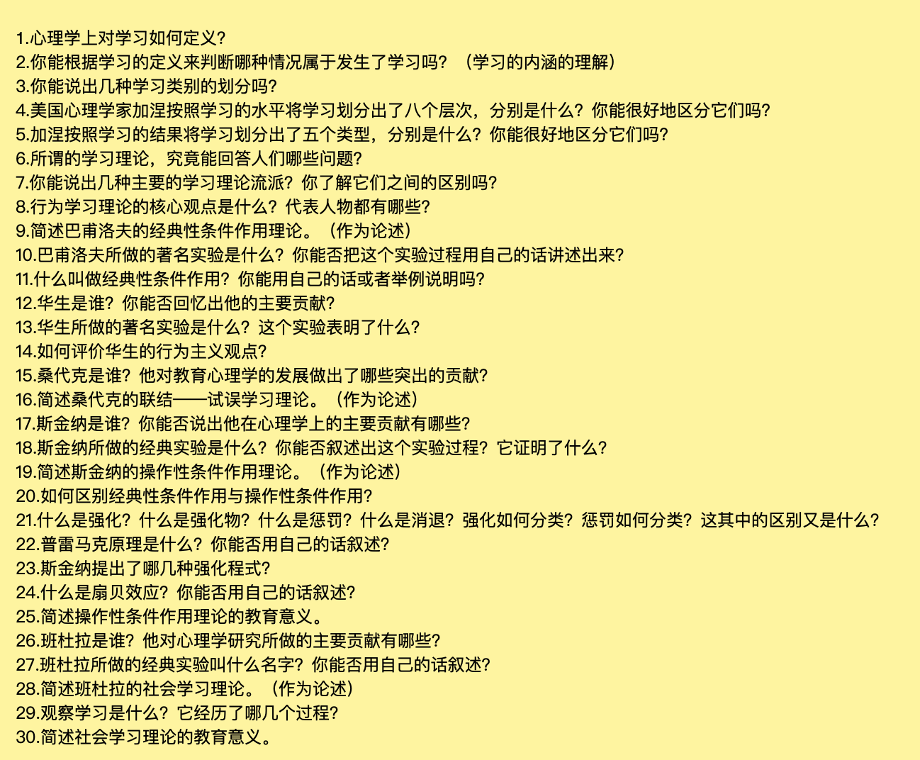 进入到“学习心理”部分的第一个重难点就是学习与学习理论部分。对于行为学习理论的把握,主要是理解实验,了解原理与机制,区分不同的人物与其提出的观点。因为行为学习理论的出现距离现在最远,已经有长达百年的历史了,因此在大考中不太会出到论述原理内容的大题(仅代表个人观点)。但是由于它的心理学第一流派的地位,并且其中一些观点如学习规律、强化、观察学习与模仿仍然是当今教育中经常被使用到的方法与策略。因此,还是要作为重点理解和掌握。
