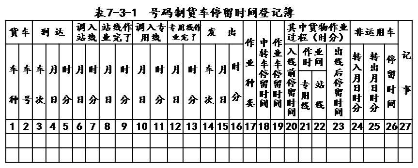 利用号码制统计货车停留时间时,按每一辆货车填写“号码制货车停留时间登记薄”,并计算其在车站的停留时间。