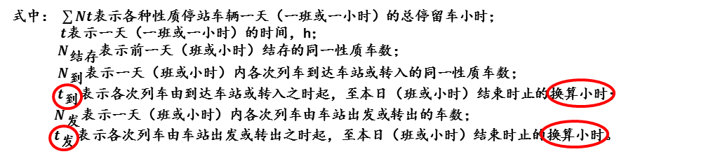 假定一日(一班或一小时)开始时结存的车辆和本日(本班或本小时)到达或转入的车辆全都停留至本日(本班或本小时)结束,并按此统计车辆的总停留车小时,然后再将本日(本班或本小时)发出或转出车辆从发出或转出之时起至本日(本班或本小时)结束之时止未停留的总车小时扣除,即可得各种性质车辆在本日(本班或本小时)的总停留车小时。