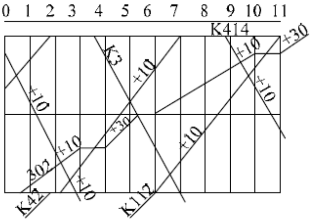 根据旅客列车运行方案,按照上述各种列车的铺画顺序,可在二分格运行图上详细铺画各种列车运行线,即所谓铺画详图。