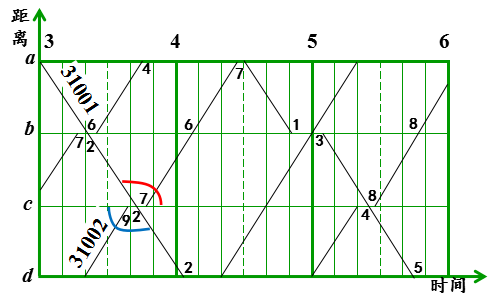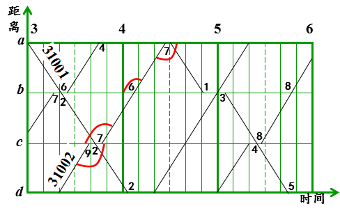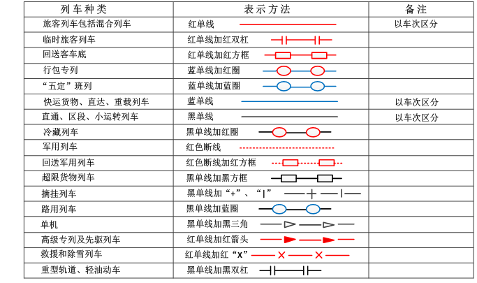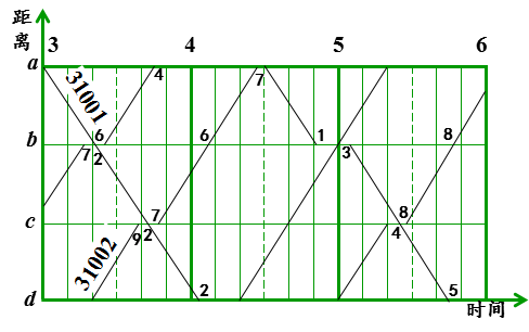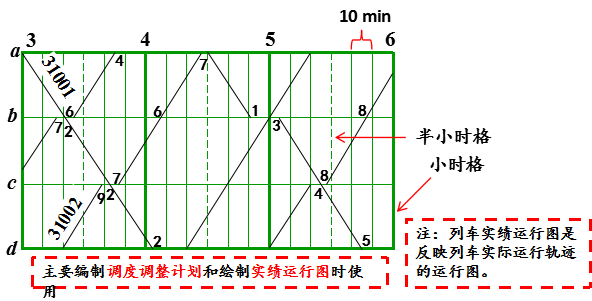 斜线表示列车运行线,列车运行线(斜线)与车站中心线(横线)的交点,为列车在车站的到、发或通过时刻