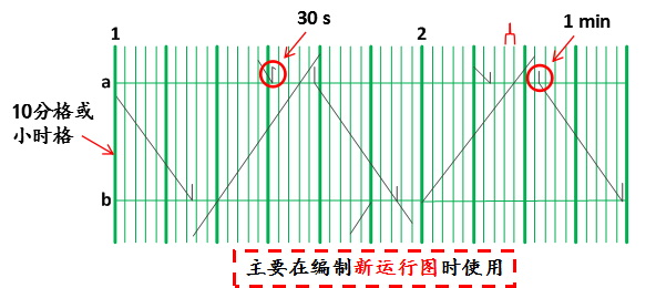 二分格运行图:横轴以2min为单位用细竖线加以划分,10分钟格和小时格用较粗的竖线表示。