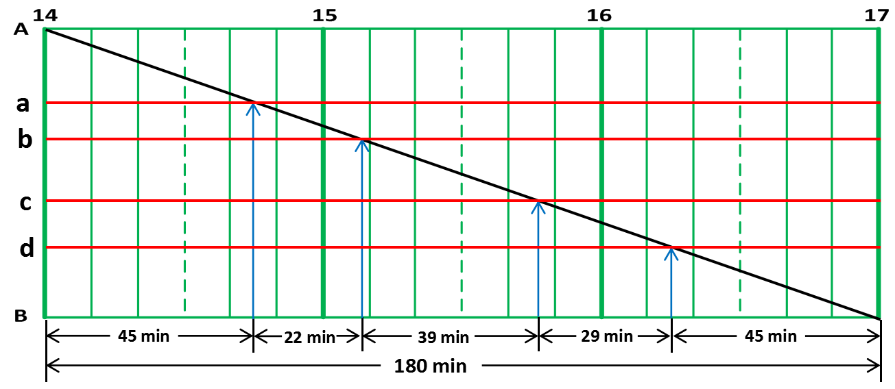 按区间实际里程的比率确定。即按整个区段内各个车站间实际里程的比例来确定横线的位置。