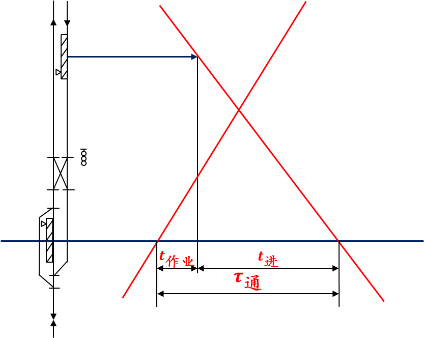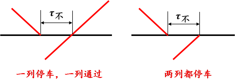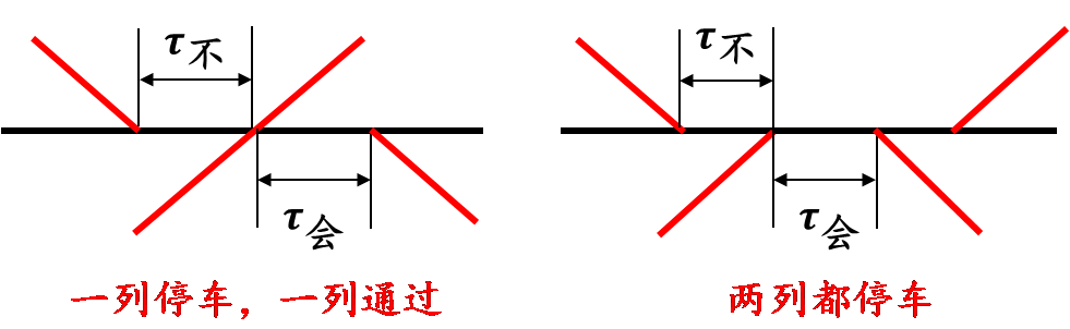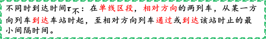 在单线区段,来自相对方向的两列车在车站交会时,从某一方向列车到达车站时起,至相对方向列车到达或通过该站时止的最小间隔时间,称为不同时到达间隔时间。