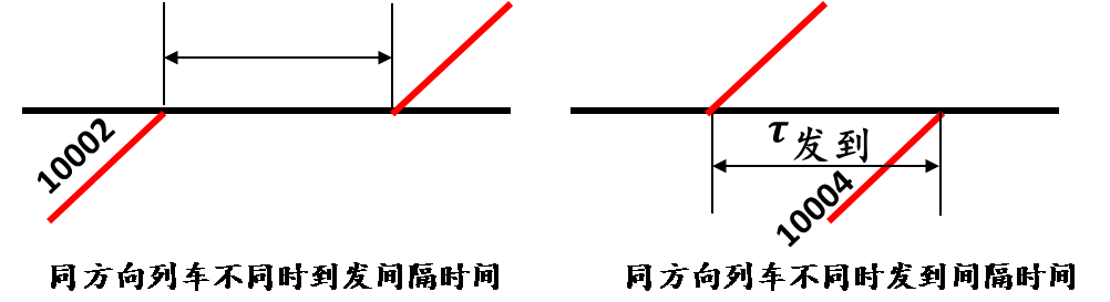 自列车由车站发出时起,至同方向列车到达车站时止的最小间隔时间,称为同方向列车不同时发到间隔时间。