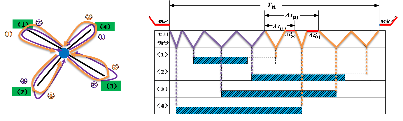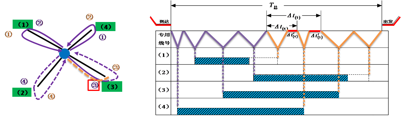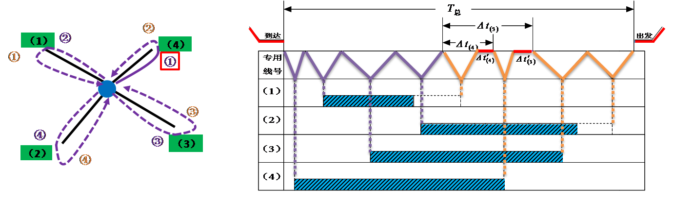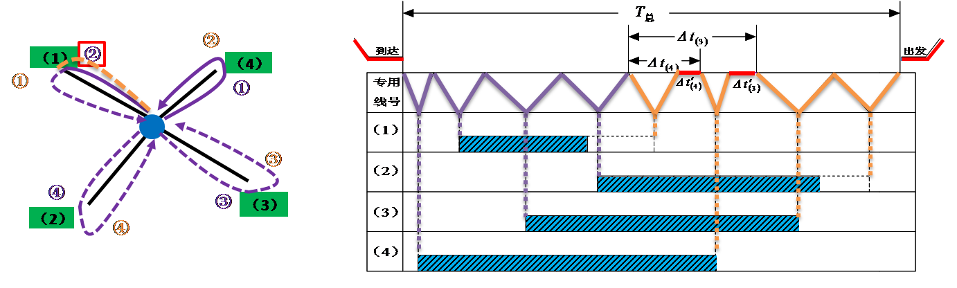 以装车站为背景,车流整列到发、一台机车作业条件下的放射形专用线取送顺序问题。其作业方法为: