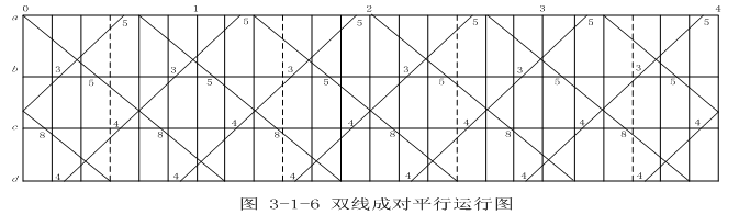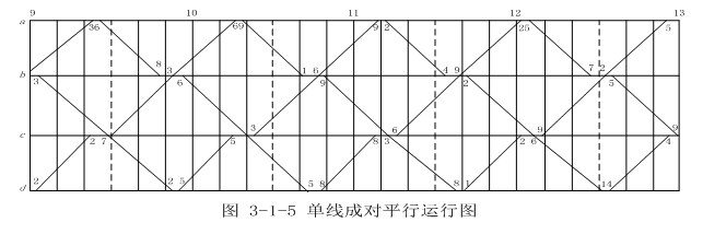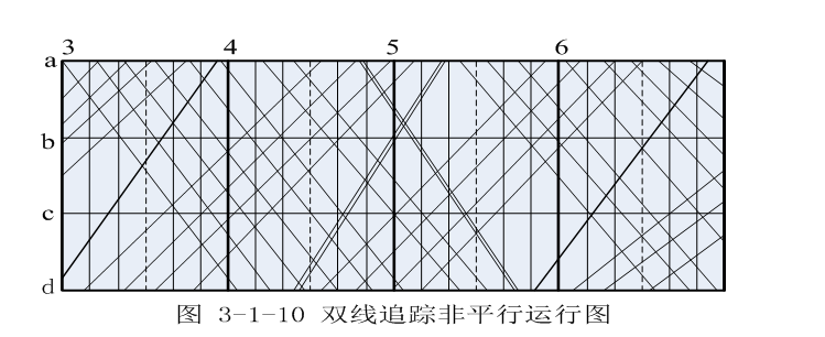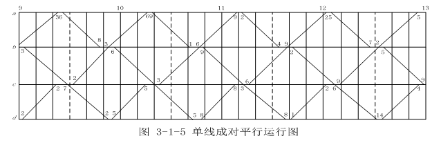 平行线运行图:在同一区间内,同一方向列车的运行速度相同,且列车在区间两端站的到、发或通过的运行方式也相同