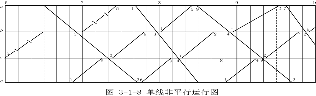 非平行运行图:在运行图上铺有各种不同速度的列车,且列车在区间两端站的到、发或通过的运行方式也不同