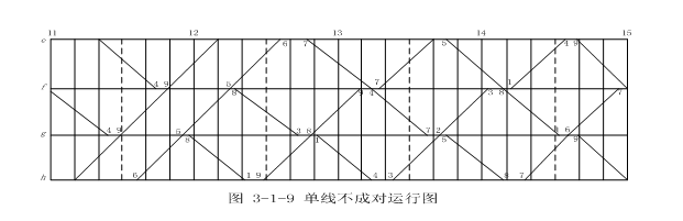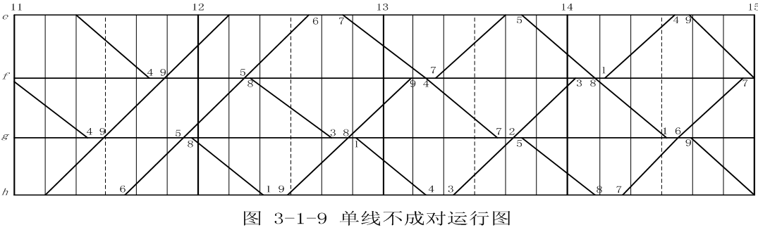 单线运行图:上下行方向列车都在同一正线上运行,两个方向列车必须在车站上进行交会