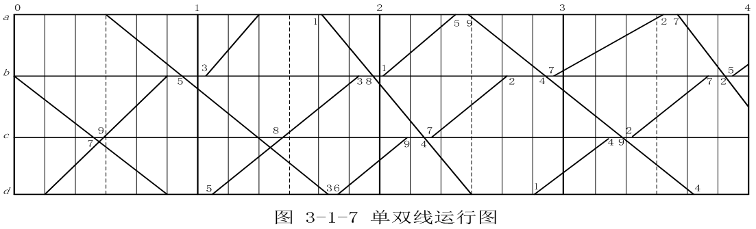 单双线运行图:在单线区间和双线区间各按单线运行图和双线运行图的特点铺划运行线