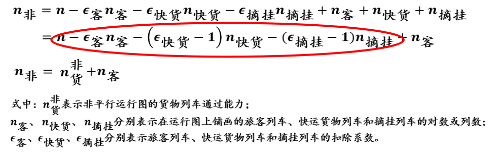先算出某区段平行运行图通过能力,然后在此基础上,扣除受旅客列车、快货和摘挂列车影响而损失的普货列车数,得出可能开行的普货列车数,再与上面三种列车数相加,其总和就是该区段非平图通过能力。
