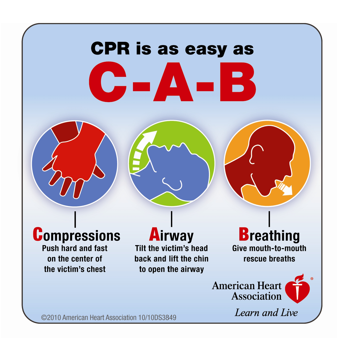 2015年10月15日,美国心脏协会(AHA)在官方网站及杂志(Circulation)上公布了《2015心肺复苏指南(CPR)和心血管急救(ECC)指南更新》。针对成人基础生命支持和心肺复苏质量(非专业施救者)提出以下建议:①鼓励迅速识别无反应情况,启动紧急反应系统,及鼓励非专业施救者在发现患者没有反应且没有呼吸或呼吸不正常(如喘息)时开始心肺复苏的建议得到强化。②强调了调度人员需快速识别可能的心脏骤停,并立即向呼叫者提供心肺复苏指导。③单一施救者的施救顺序:先开始胸外按压再进行人工呼吸(C-A-B而非A-B-C),以减少首次按压时间的延迟;单一施救者开始心肺复苏时应进行30次胸外按压后做2次人工呼吸。④强调了高质量心肺复苏:以足够的速率和幅度进行按压,保证每次按压后胸廊完全回弹,尽可能减少按压中断并避免过度通气。⑤建议的胸外按压速率是100-120次/分钟(此前为“至少”100次/分钟)。⑥建议的成人胸外按压幅度是至少5厘米,但不超过6厘米。