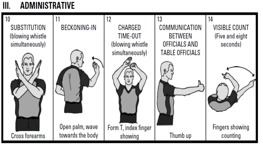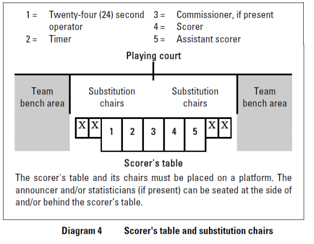 The commissioner shall sit between the scorer and the timer. His primary duty during the game is to supervise the work of the table officials and to assist the referee and umpire(s) in the smooth functioning of the game.