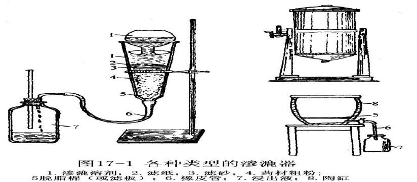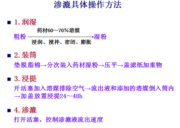 将药材粗粉装入渗漉筒中,不断添加浸出溶媒,由于重力作用使其渗过药粉,从下端出口流出浸出液,在流动过程中浸出有效成分的方法。所得浸出液称“渗漉液”。